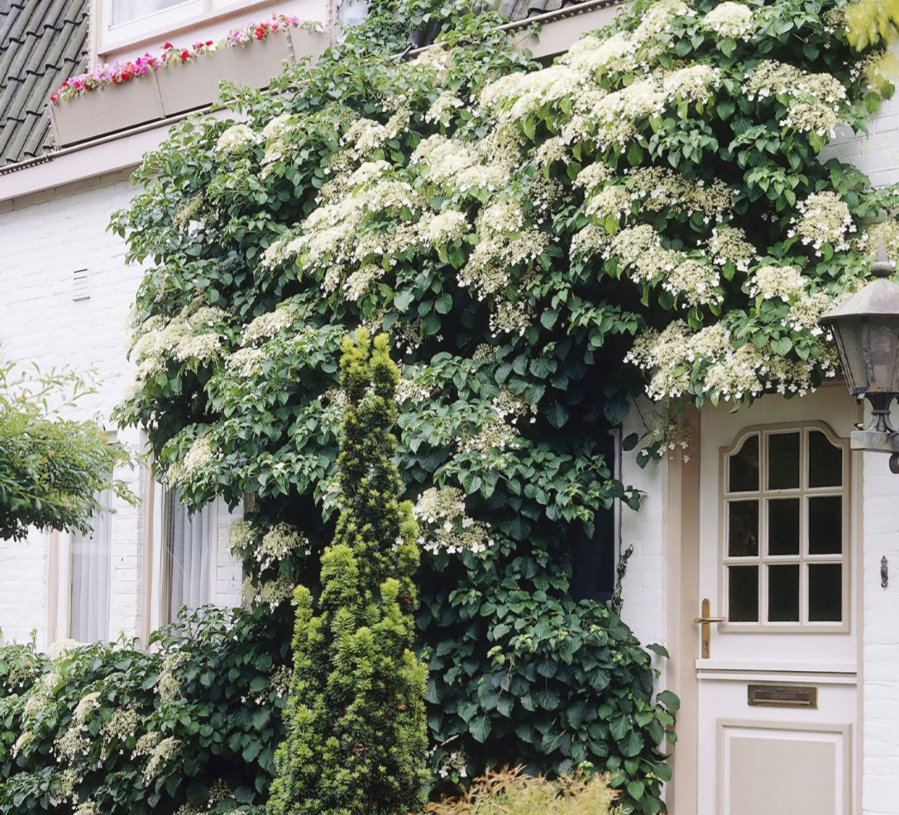 В первые 1–2 года после посадки растет медленно, затем рост ускоряется до 0,7–1 м за сезон. Вьется, может как стелиться по земле, так и оплетать любую опору, выпускает множество боковых побегов с воздушными корнями. Длина взрослого растения – до 20 м. Листья темно-зеленые, широкие, с зубцами по краям, черешки длинные. Гортензия начинает цвести на 2–3-й год после посадки, иногда позже. Обильно цветет с июля до августа. Цветки бело-кремовые, приятно пахнущие, собраны в щитковидные соцветия диаметром до 20 см.