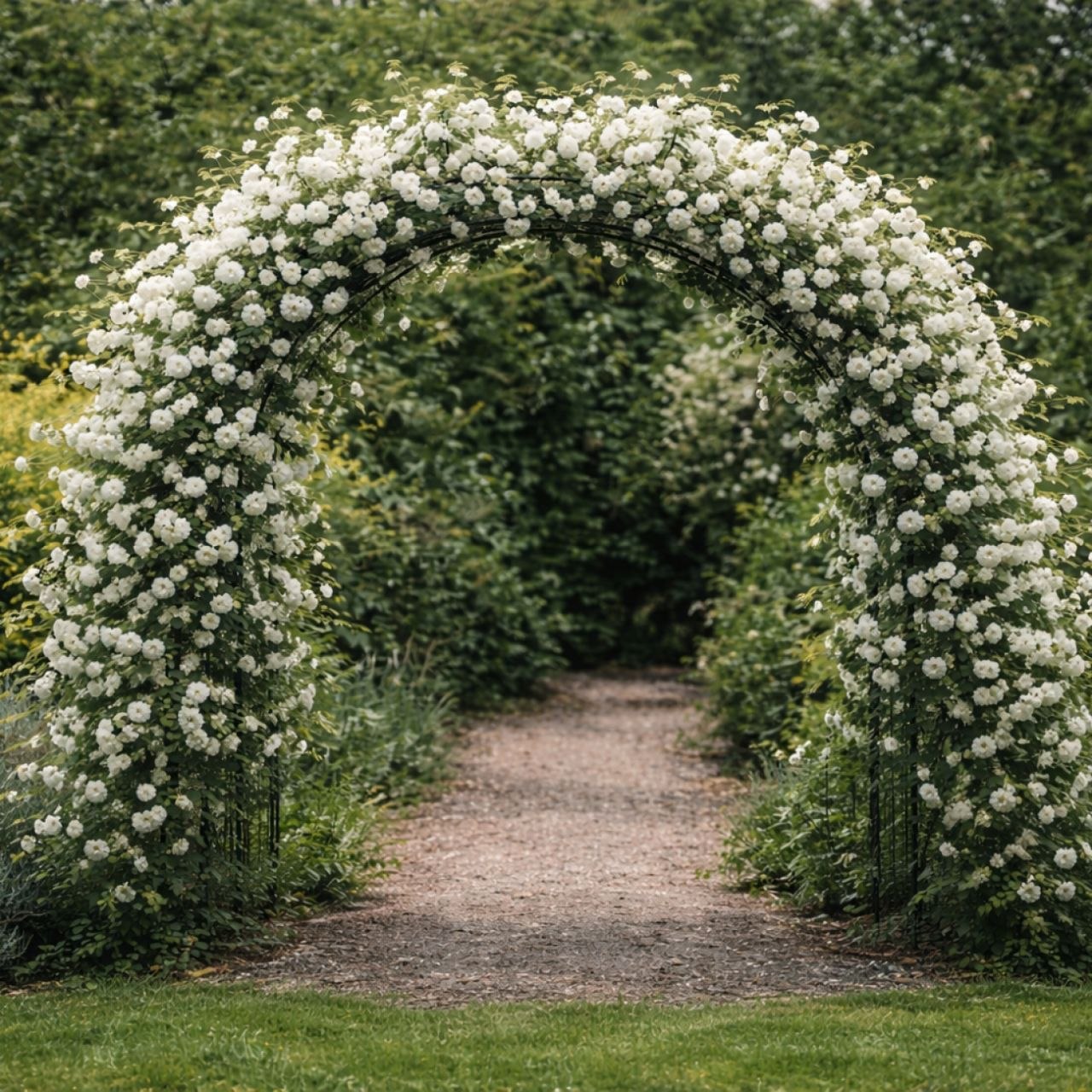 обычно называемая розой Банксиана, — это сильная вечнозеленая плетистая роза, родом из Китая. Ее можно выращивать на перголе, беседке, заборе или стене, где она будет подниматься и покрывать до 6-8 метров или более. Махровые белые цветы с густо упакованными лепестками цветут гроздьями в мае-июне без повторного цветения. Цветы слегка пахнут (напоминают фиалки), но иногда кажутся почти непахнущими. Длинные, гладкие, гибкие, почти без шипов стебли покрыты зелеными листьями (каждый с 5-7 мелкопильчатыми листочками).