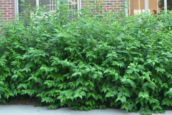Листопадный кустарник до 2,5 м высотой, крона густая, раскидистая. Растёт быстро. Побеги прямостоячие, молодые побеги красновато-бордовые. Листья широкояйцевидные, крупные, до 10-12 см длиной. При распускании листья розовато-коричневые, затем нежно-желтые, матовые. Осенью краснеют. Цветки кремово-белые, собраны в многочисленные щитковидные соцветия. Иногда цветет второй раз осенью. Хорошо поддаётся стрижке, подходит для живых изгородей