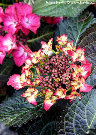 Куст высотой до 1 м, густой, компактный. Листья крупные, темно-зеленые с глубокими бордовыми коричневыми оттенками и светло-зелеными прожилками. Осенью становятся темно-красными. Стерильные цветки по краям соцветия раскрываются насыщенно пурпурно-красным цветом. Плодущие центральные цветки ярко-пурпурно-красные, остаются почти всегда в нераскрытых бутонах. Цвет цветка определяется рН почвы. Для розовых цветов почва должна быть щелочной. В кислой почве цветки меняют цвет на фиолетовый или даже синий. Цветение с июля до наступления холодов на побегах прошлого года.