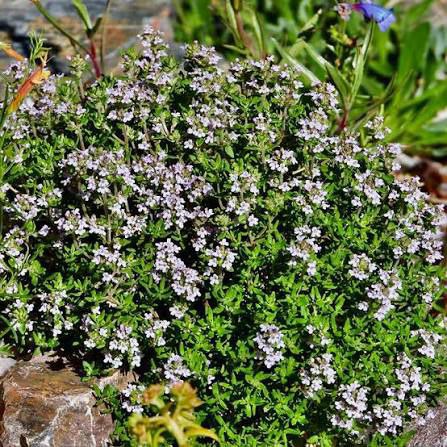 обладает традиционным вкусом и ароматом тимьяна, а также летним цветением в компактной форме. Прекрасный карликовый тимьян в высоту и ширину до 25 см. для ваших садов с пряными травами, альпинариев или посадки в горшки. Его крепкие прямостоячие стебли облегчают сбор листьев.