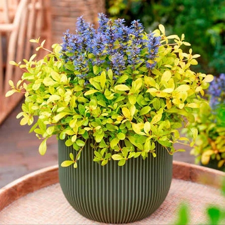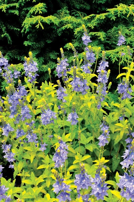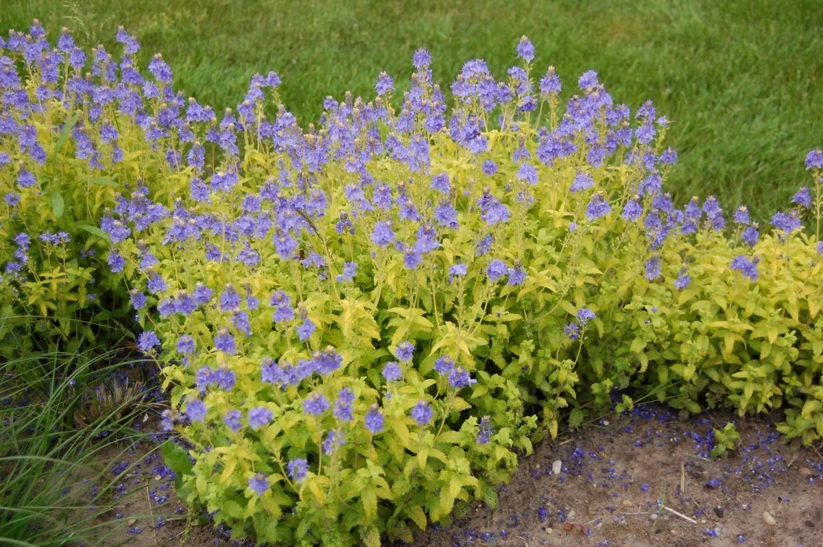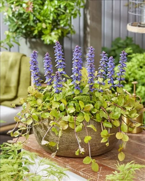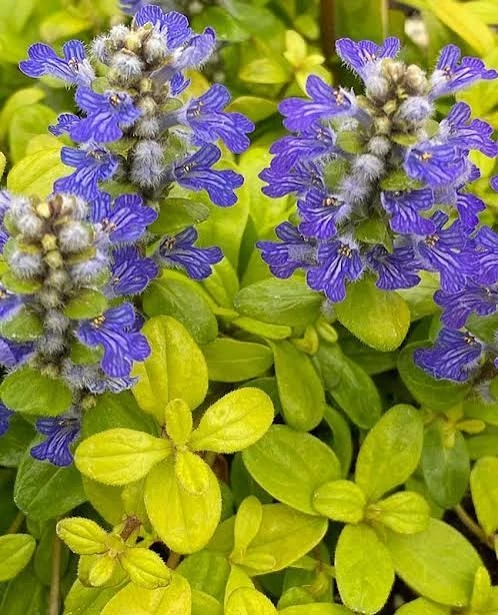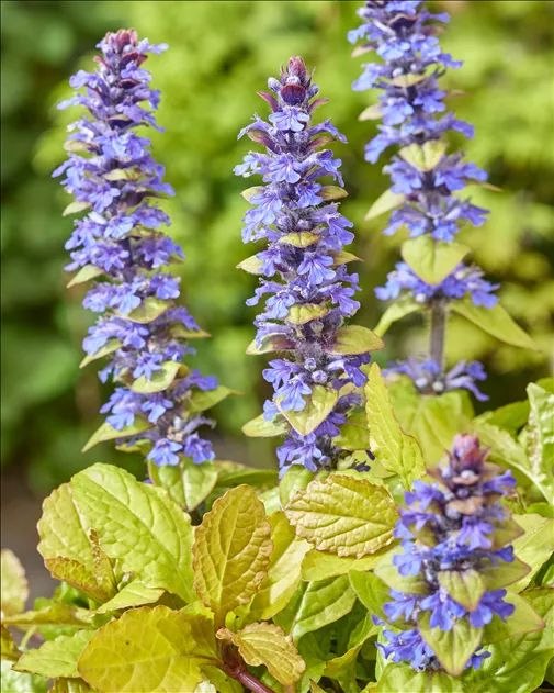 или «Золото Ацтеков» обладает желтой окраской листьев и голубыми цветками. Низкорослый многолетник высотой 20 см. в диаметре до 40 см. Листья овальные, салатово-желтые. Цветки голубые, мелкие, собраны в колосовидные вертикальные соцветия. Цветение с мая по июль. Растет на хорошо освещенных участках.