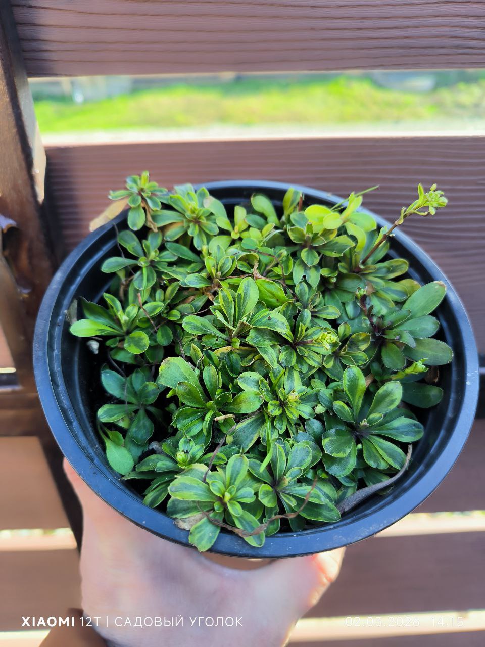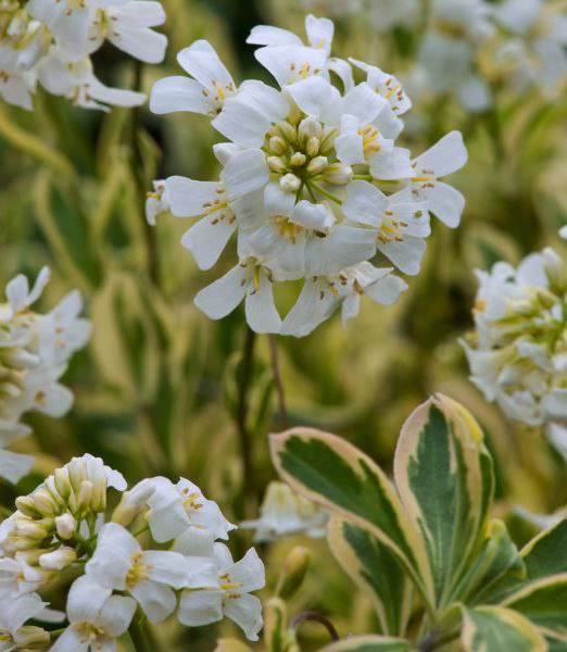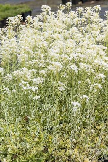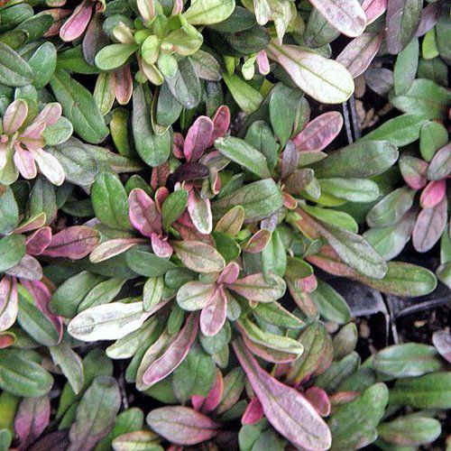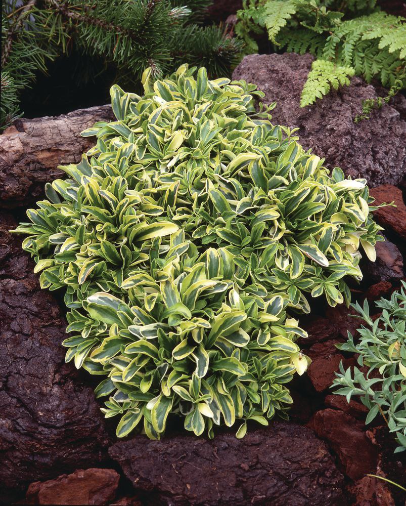 Компактное, образующее коврик, вечнозеленое многолетнее растение высотой до 10 см , разрастается до 30 см . с розетками узкопродолговатых темно-зеленых листьев с ярко-желтыми краями и кистями белых цветков весной.Осенью и весной листья могут приобретать красноватый оттенок
