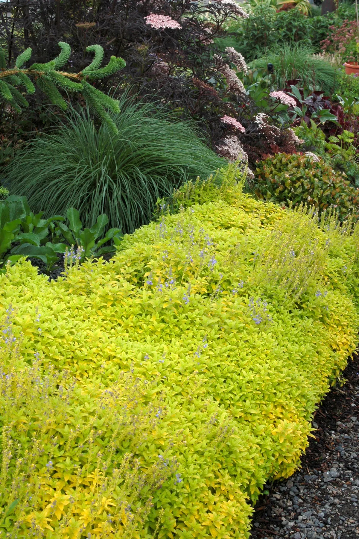 Многолетнее травянистое растение до 50 см высотой и 85 см шириной. Отличается от других сортов цветом листочков. Они зелено-желтого цвета, а весной еще и пестрые, вариегатные. Цветет лавандовыми цветами с июня по сентябрь. После первого цветения в июле растение необходимо срезать наполовину, оно зацветет снова и будет расти компактнее.