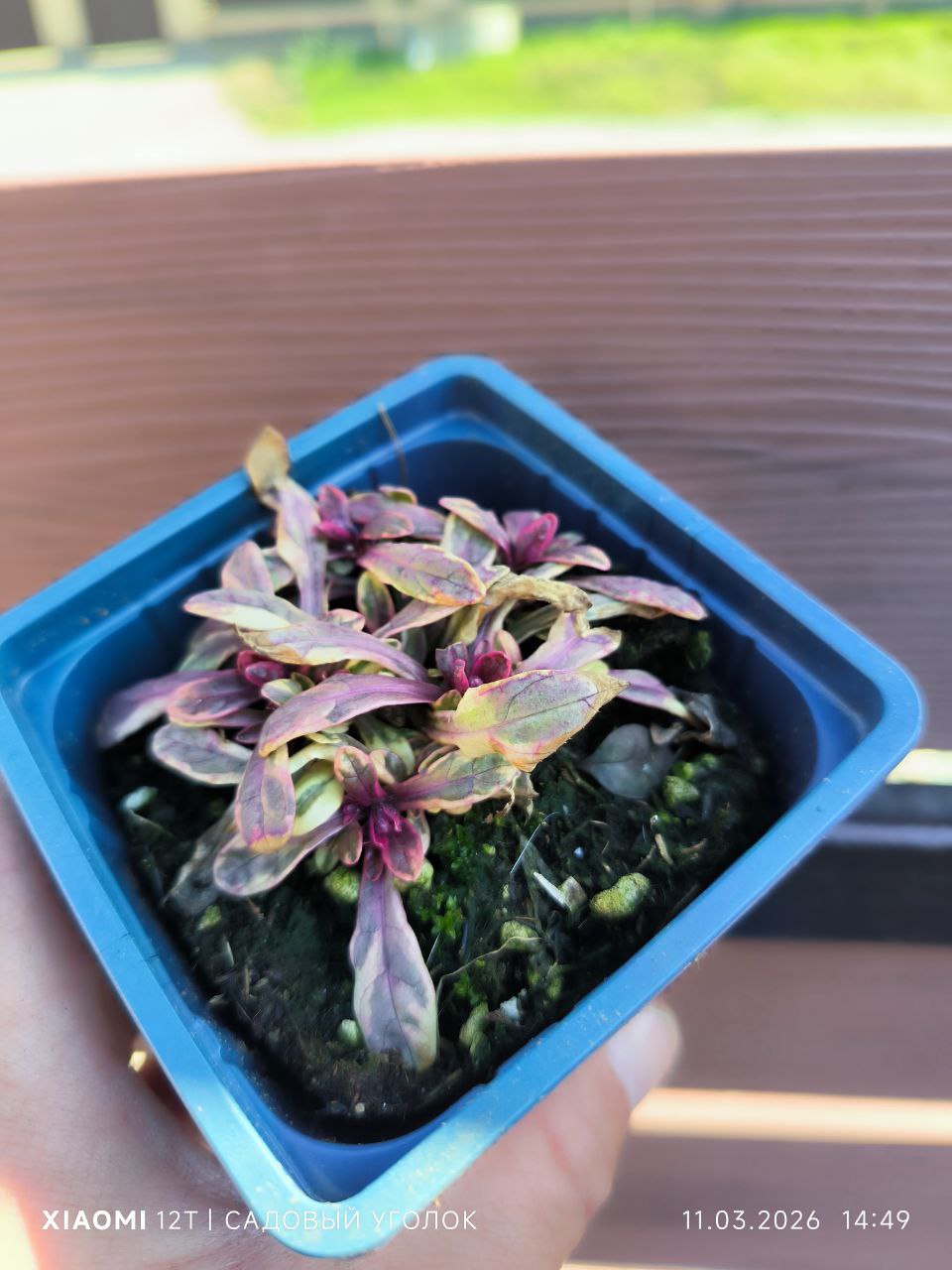Многолетнее вечнозелёное растение , образует массу густой, блестящей, пестрой листвы с пурпурно-розовым оттенком. Высотой до 15 см. В мае-июне и снова в августе появляются колоски красивых синих и фиолетовых цветов. Особенно красивые цветы появляются даже в тенистых местах - идеально для посадки под большими кустарниками или заполнения контейнера