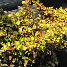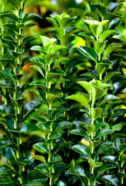 Глянцевая, вечнозелёные волнистая золотисто-желтая листва с красно-оранжевыми краями, в прохладную погоду приобретает интенсивный оранжевый и красный оттенок; необыкновенный сорт, идеально подходящий для формирования топиариев или живых изгородей. Идеален для контейнеров и бордюров благодаря компактности около 100-150 см.