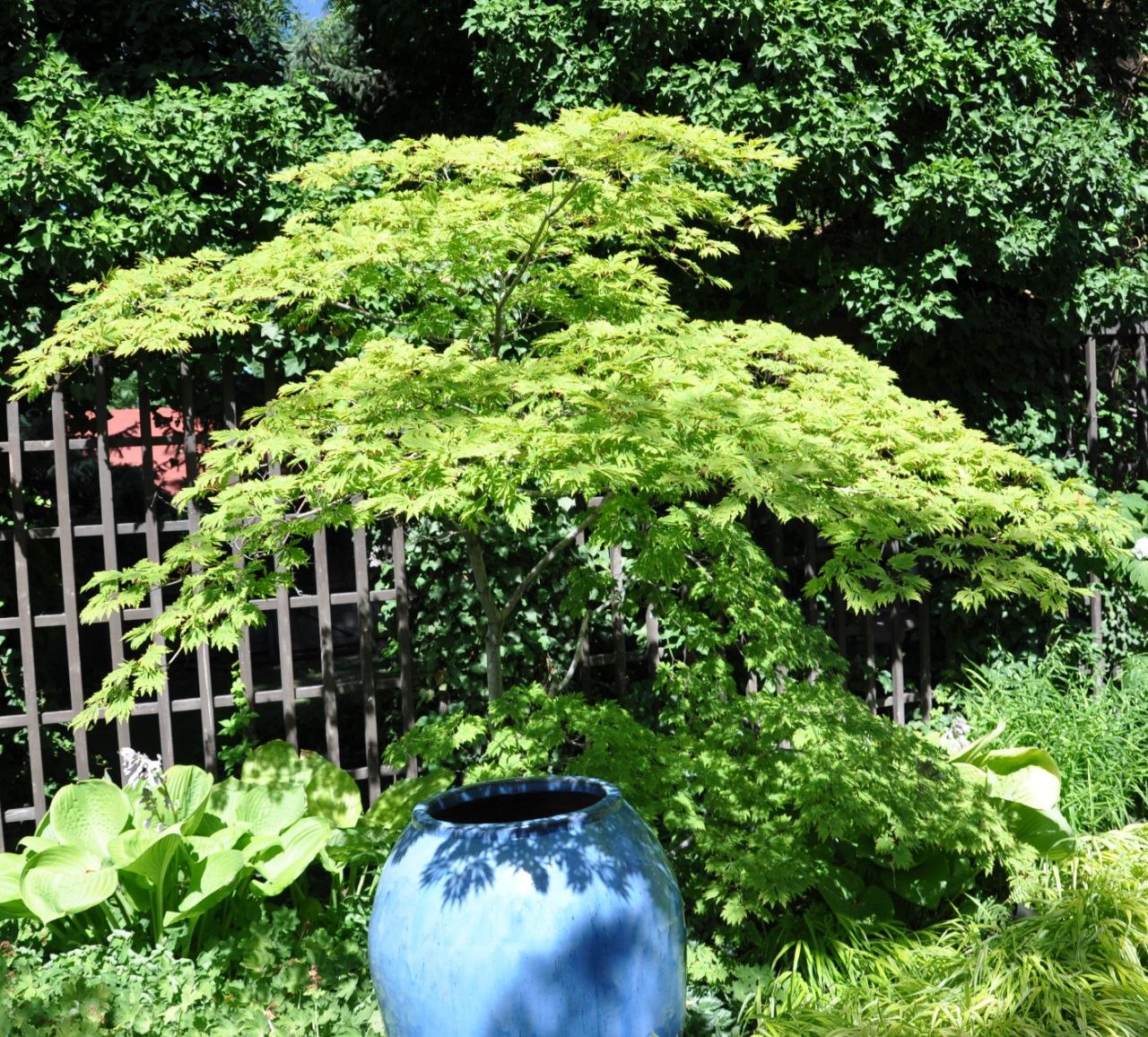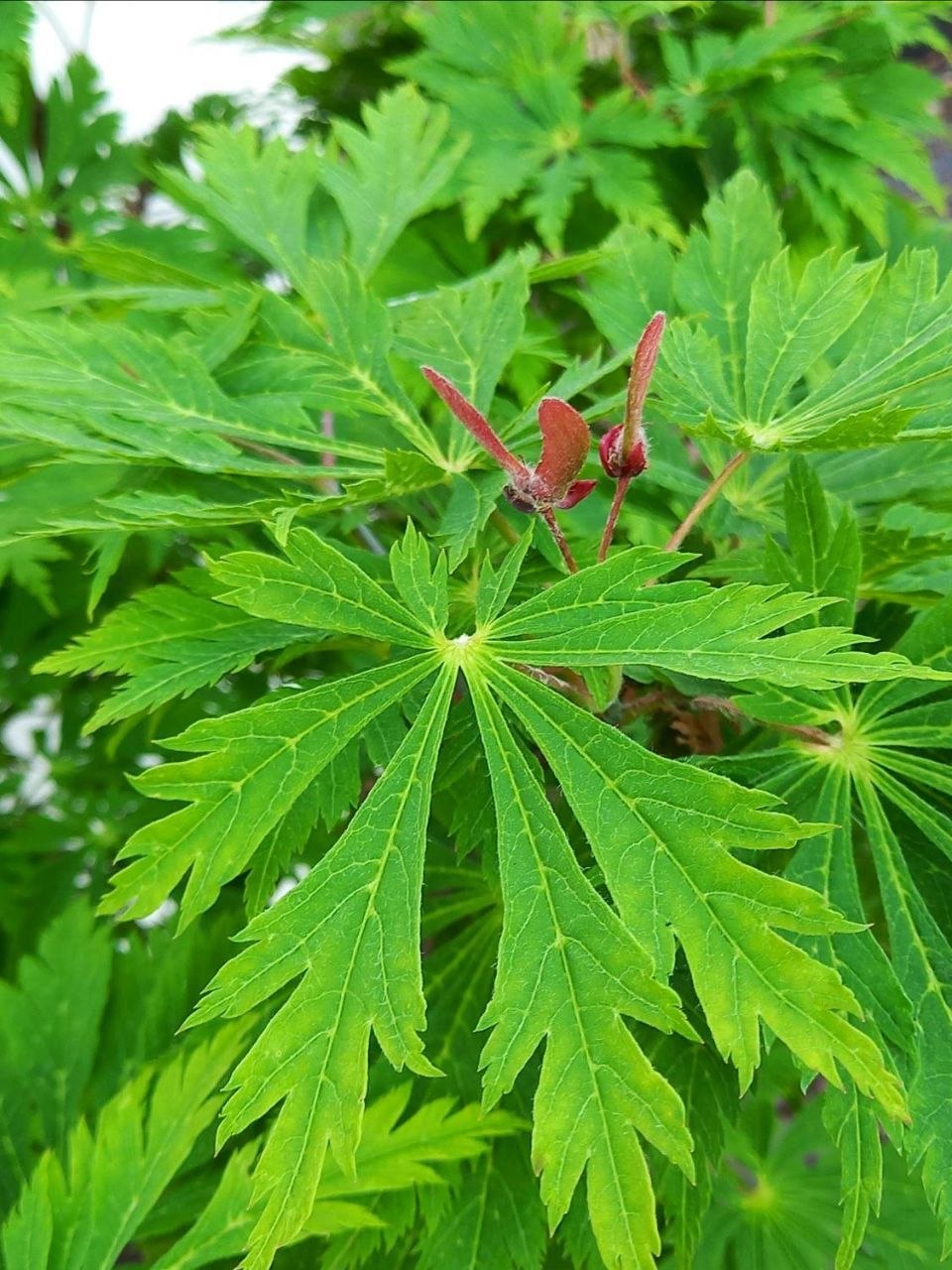 карликовый, холмистый, листопадный многоствольный кустарник или небольшое дерево, которое обычно медленно растет до 3 метров в высоту. Имеет пальчатые, почти папоротниковидные средне-зеленые листья, которые глубоко разделены на 9-11 зубчатых и разрезных долей. Листья становятся малиновыми осенью. Маленькие красноватые цветы появляются весной до листьев и уступают место самарам, которые созревают в конце лета — начале осени. Как и у многих кленов, цветы довольно привлекательны вблизи, но не особенно броские издалека. Название сорта переводится как «листва аконита» в связи с предполагаемым сходством разделенных листьев с листьями аконита. Этот сорт также иногда называют клен полнолунный папоротниковидный.