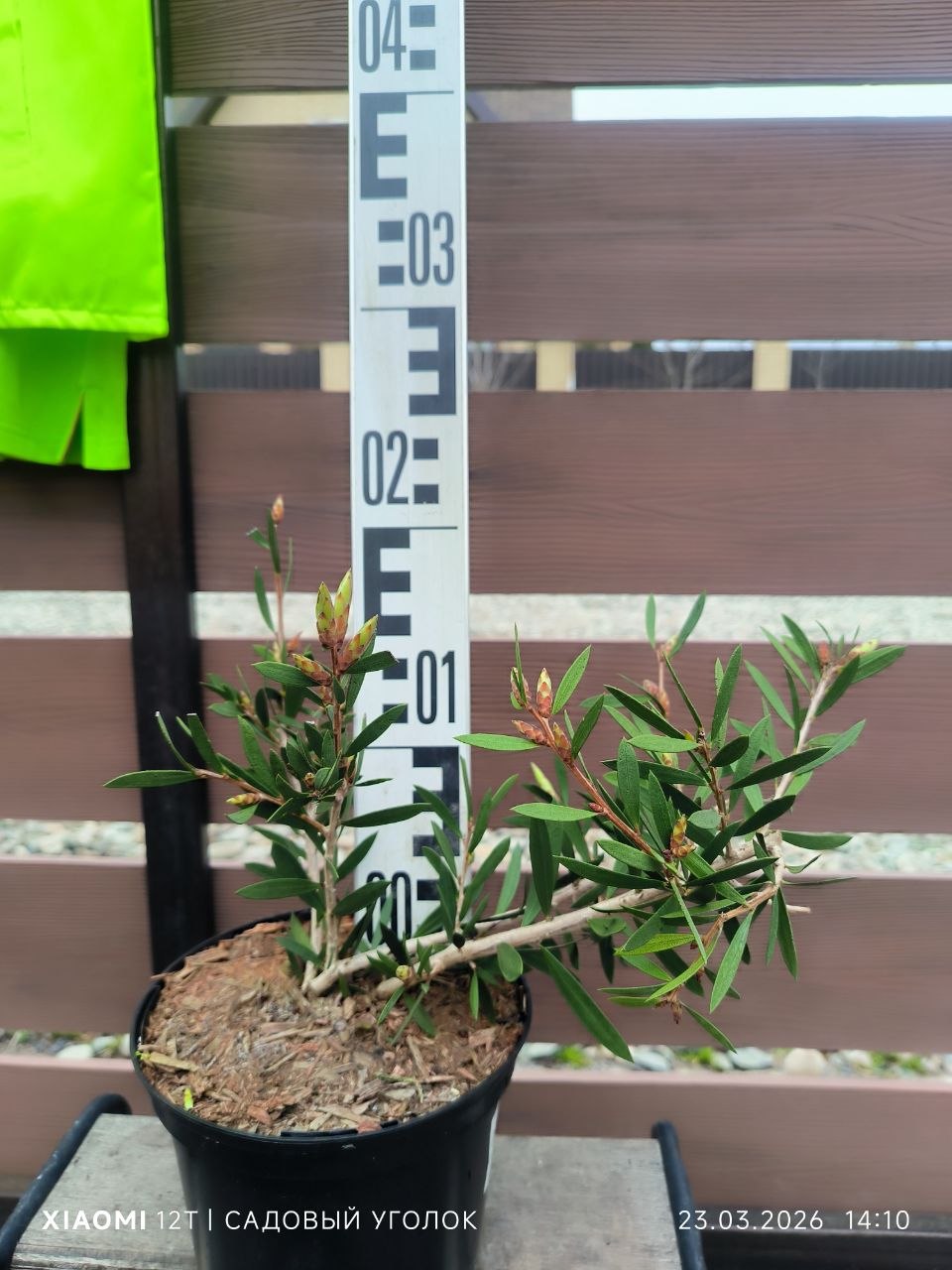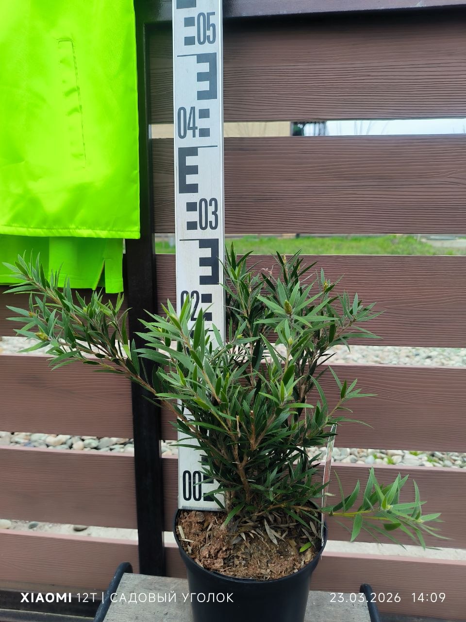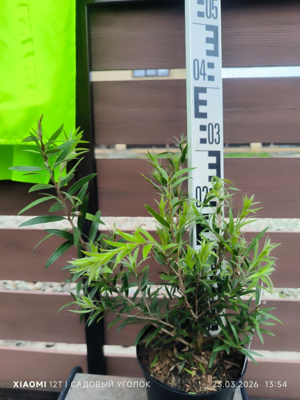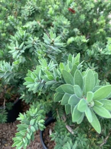 Узкие, кожистые серо-зеленые листья при растирании издают приятный лимонный аромат. Компактный кустарник, достигающий в зрелом возрасте высоты и ширины около 1–1,5 метров.