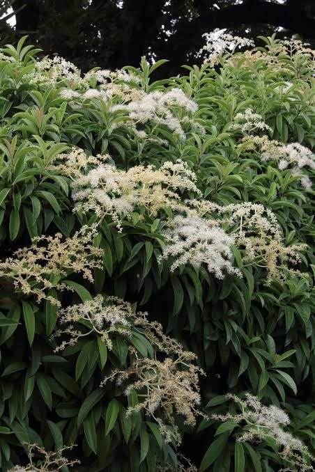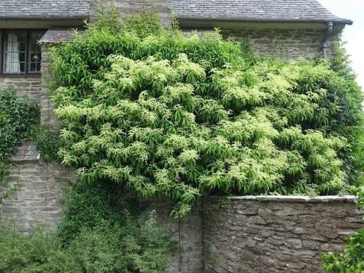 Название, возможно, незнакомо, но это растение очень ценно для сада. Оно вечнозелёное, с длинными кожистыми листьями. Это самоцепляющаяся лиана до 6 метров . которая может обвить практически любую опору, а затем остановиться. Цветёт кремово-белыми цветами в сентябре-октябре, образуя пушистые метёлки длиной 10-15 см с медовым ароматом, и она любит прохладное утреннее солнце или постоянное затенение. Вероятно, единственная причина, по которой её не считают гортензией, заключается в том, что у неё нет прицветничных стерильных цветков.