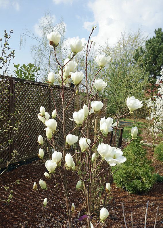 Этот сорт отличается полумахровыми белыми цветками до 20 см . с мягким зеленоватым или розоватым оттенком у основания чашечки — отсюда и название «Нефритовая лампа». Цветет весной до появления листьев. Растет медленно, образует узкую, правильную пирамидальную крону. Высота до 3-5 метров , ширина 2-3 метра .