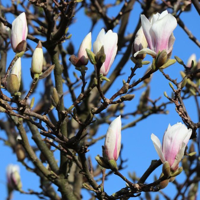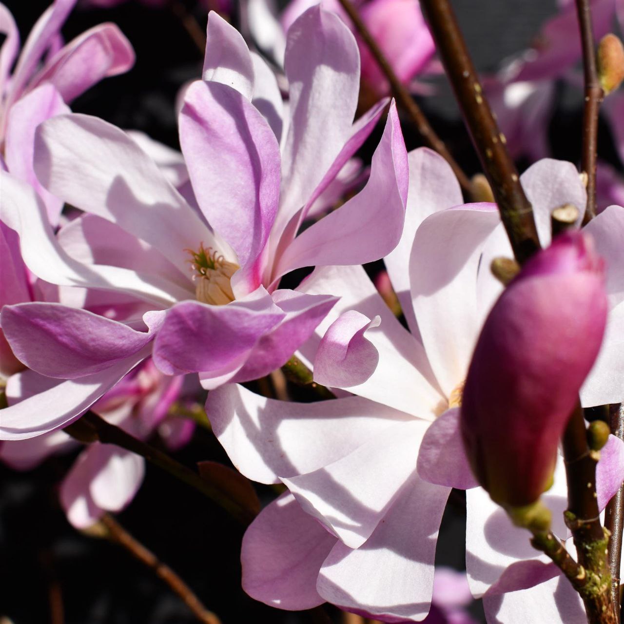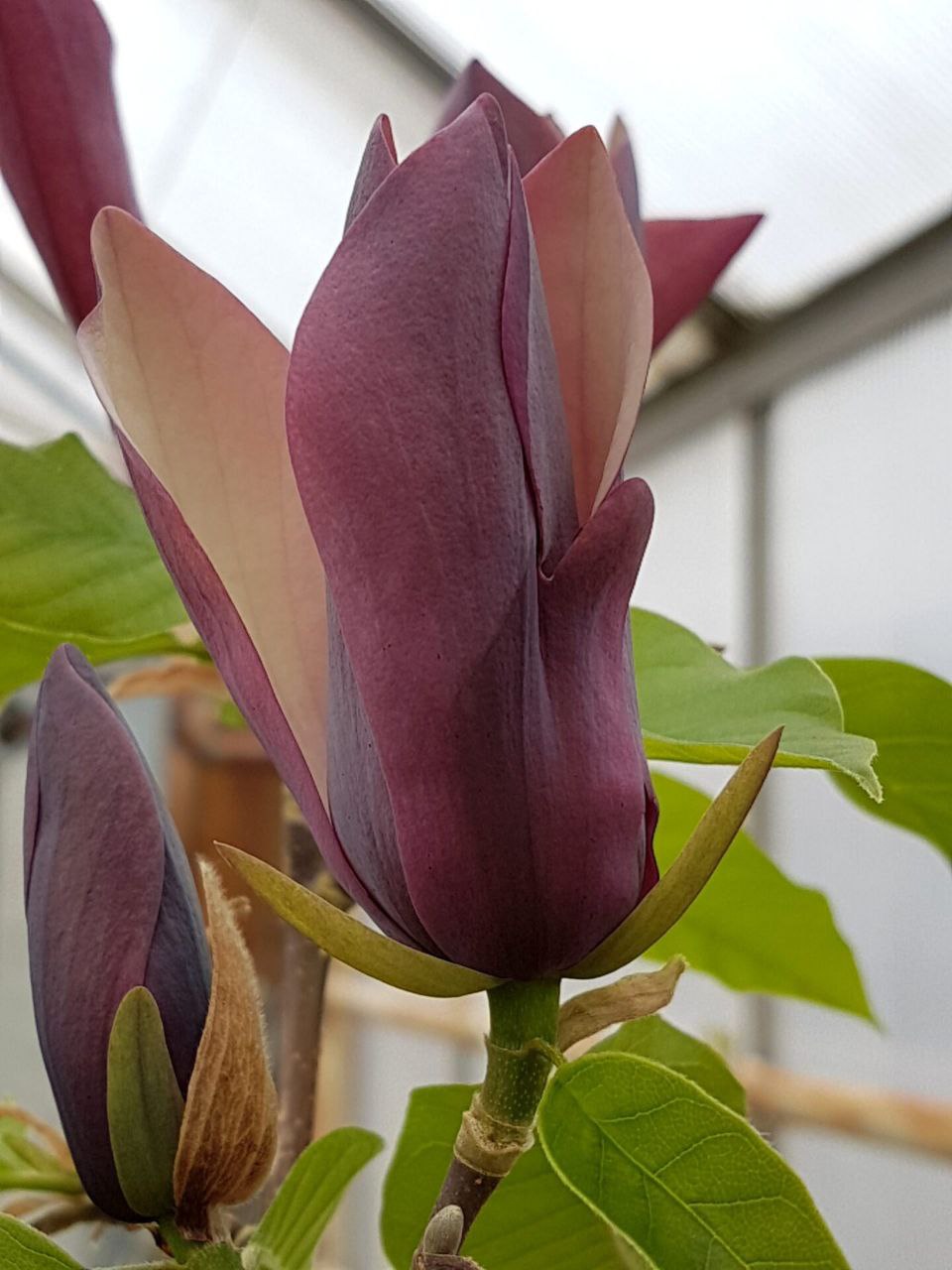 Открытие магнолии STARBURST было волнительным. Она не только имеет великолепные цветы, но и имеет нечто очень практичное для небольших садов — более узкий, почти кустовидный габитус. Ее ароматные цветы 15-20 см в диаметре, пурпурно-красные снаружи и гораздо бледнее внутри с розовыми звездами, нанесенными аэрографом на фон. Они начинают цвести обычно с конца апреля до начала мая, что помогает им избежать поздних заморозков. Листопадные листья средне-зеленые и ярко-фиолетовые по мере появления. Она растет умеренно, образуя строго вертикальный куст с короткими боковыми ветвями, около 4 метров в высоту и 2 м в ширину. Магнолия STARBURST была выведена Вэнсом Хупером из Новой Зеландии как скрещивание m. cylindrica и Genie и введены в 2006